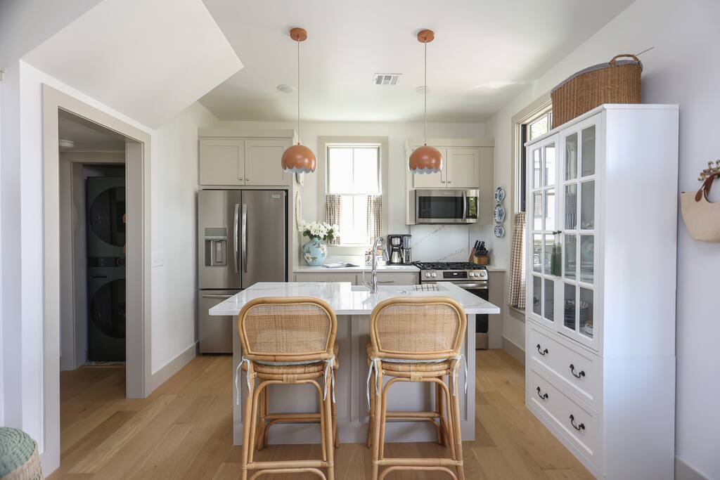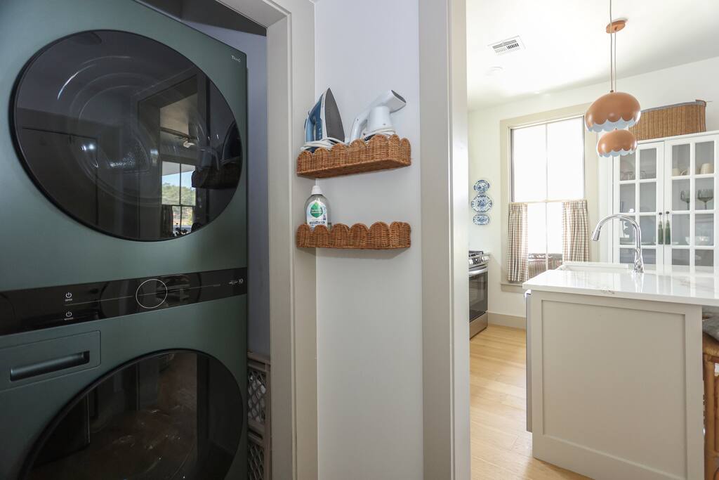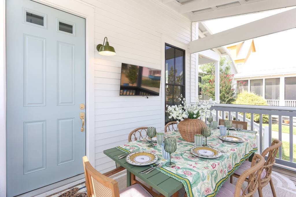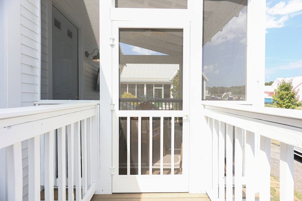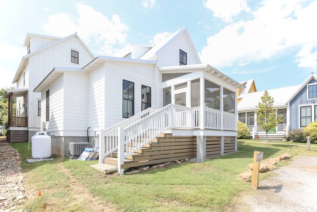 - Sleeps up to 7 – 2 bedrooms, 2 bathrooms - Master suite (downstairs): king bed + private bath (shower only) - Upstairs retreat: 2 queen beds, 2 twin trundles, full bath with tub, projector for movie nights, closet with toys & games - Fully stocked kitchen for easy meals including a start set of spices, cooking oils, pots, pans, etc. Coffee, tea and sugar are also provided. - Washer and dryer available on downstairs along with a starter set of laundry supplies - Outdoor spaces: front porch with lounge furniture + screened side dining porch - Entertainment: board games, ladder toss, sports equipment, utility wagon and beach towels - Golf cart included for exploring Carlton Landing - Walkable location: parks, restaurants, pop-up shops, pools, and lakefront amenities just steps away